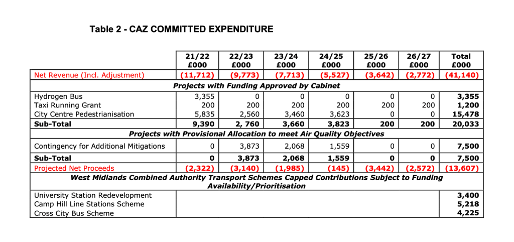 £5.2million was due to be allocated to the Camp Hill Line, £3.4 million for the University Station and £4.2 million for the Cross City Bus Scheme, however these funds are now relegated to only happen if the CAZ makes sufficient revenue.