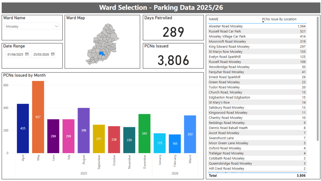 We have obtained data from the council of the number of Penalty Charge Notices (PCNs) issued in Moseley ward in 2025/6.