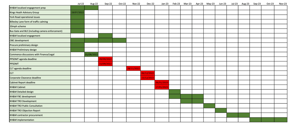 The timeline above shows the expected progress – the next stage being preparation of the detailed designs for the LTN, Billesley Lane Traffic Calming, Addison Road bus gate and extension of the 20 mph zone.